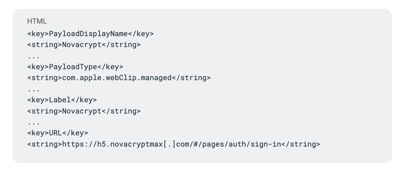 Figure: Excerpt from the Novacrypt.mobileconfig file, showing it creates a WebClip named “Novacrypt” that opens a URL to h5.novacryptmax[.]com.