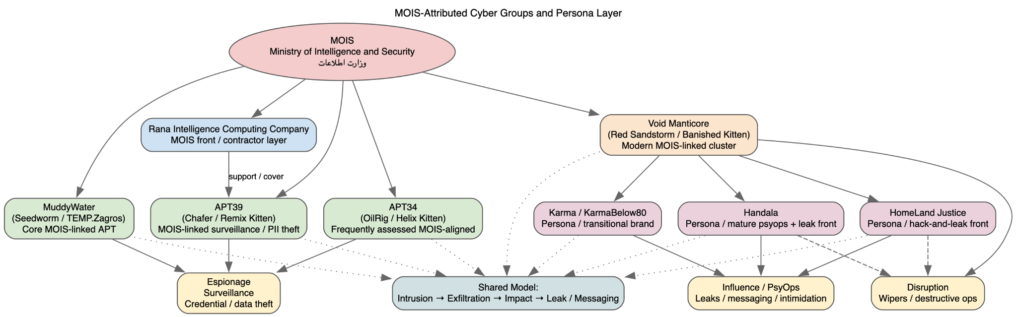 What distinguishes this ecosystem is the degree to which these phases are integrated and interchangeable. The same intrusion can evolve from a covert surveillance operation into a disruptive attack or an influence campaign without requiring a fundamental shift in tooling or access. This reflects the modular architecture described earlier, but at an organizational level it also implies centralized capability management. MOIS oversight provides the mechanism through which these modules can be allocated, combined, and sequenced in accordance with mission objectives.