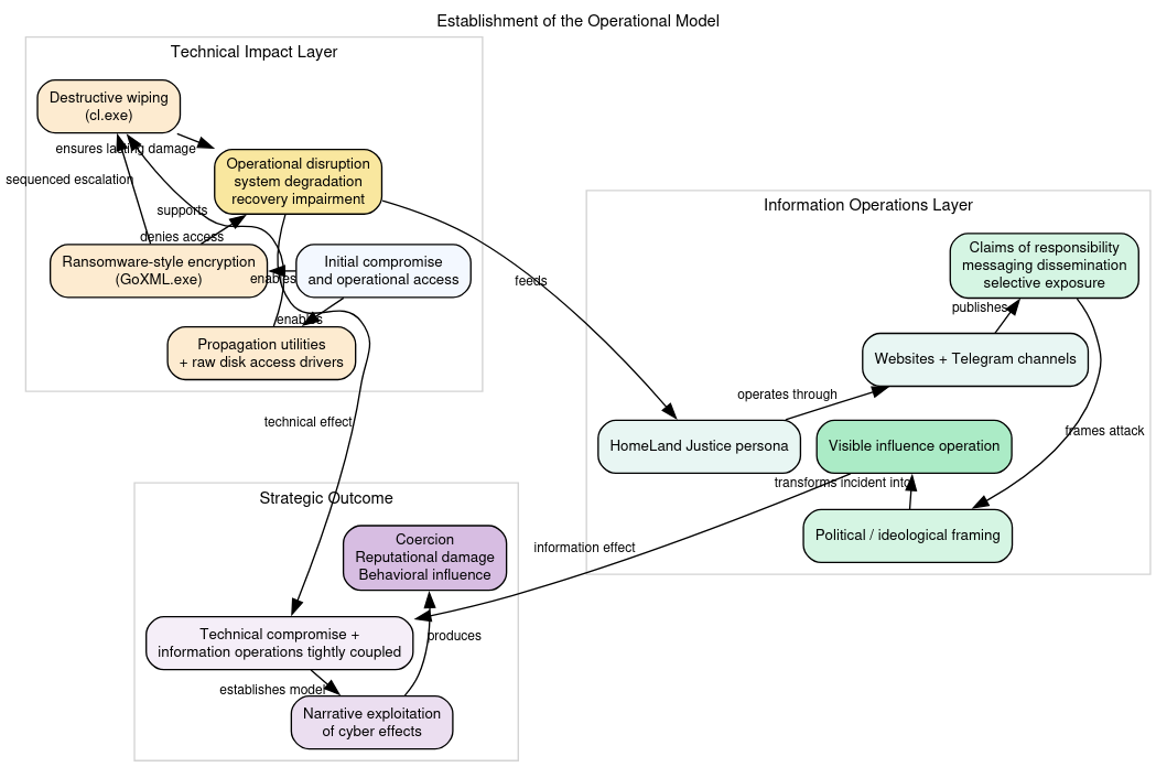 Equally important was the deliberate and immediate move to public attribution and narrative control. Under the Homeland Justice persona, the actors claimed responsibility, released messaging, and framed the attack within a political and ideological context. This transformed the operation from a purely technical incident into a hybrid cyber–influence event, where the technical damage served as the foundation for broader psychological and reputational impact. The Albania campaign thus established a durable operational model: gain long-term access, prepare the environment, execute coordinated destruction, and rapidly exploit the event through controlled public disclosure to achieve strategic influence.