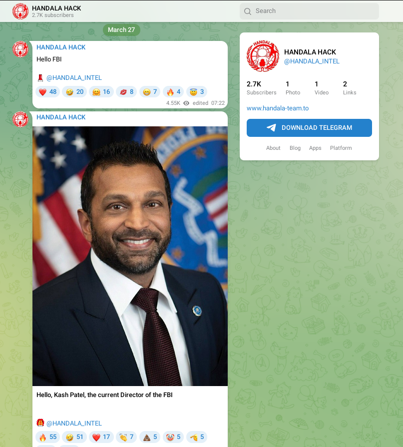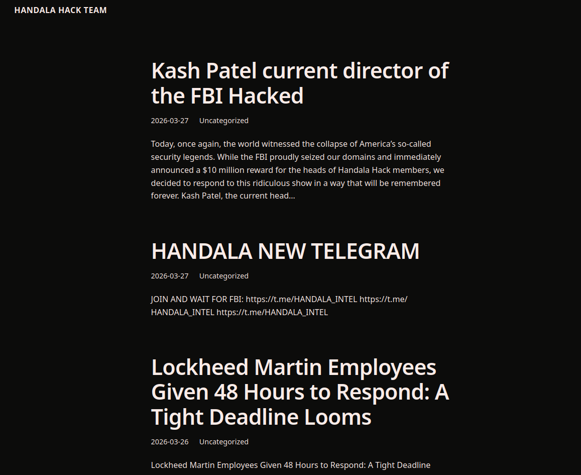 Historically, each wave of leaks follows a recognizable pattern. A new or resurfaced domain appears, often with the familiar handala-hack naming structure. Within a short time window, posts are published asserting compromise of a high-value target. These posts are then amplified through Telegram channels now including identifiers such as @HANDALA_INTEL and further propagated via X accounts. The domain serves as the canonical reference point, but the operational impact is generated through distribution. Even when domains are seized or taken offline, the narrative persists because it has already been exported to other channels.