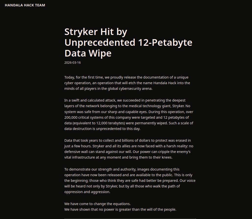 The most clearly substantiated case of material operational impact is the attack against Stryker Corporation. Reporting indicates that the intrusion disrupted core business functions, including order processing, manufacturing, and shipment operations, with recovery extending over multiple days. The incident also reportedly resulted in the remote wiping of tens of thousands of devices, affecting employees across multiple regions and, in some cases, impacting personally owned devices enrolled in enterprise systems. This represents a genuine destructive and operational cyber event, distinguishing it from the majority of Handala’s activity. The scale and severity of this incident further triggered a law enforcement response, including domain seizures targeting Handala infrastructure, indicating that the event crossed the threshold from influence activity into infrastructure-level concern.