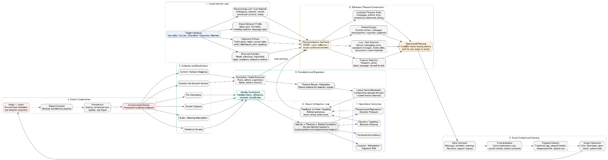 Operationally, this surveillance layer supports transnational repression by enabling targeted, person-centric campaigns against dissidents, journalists, and opposition figures. Continuous monitoring yields sensitive personal and organizational insights that can be selectively disclosed, used to intimidate, or leveraged to shape narratives in subsequent leak operations. This tight coupling between covert collection and overt exposure allows actors to move seamlessly from surveillance to psychological pressure, aligning technical activity with influence objectives. The result is a persistent, adaptive capability that extends the campaign’s reach from network disruption to sustained coercion of individuals and communities across borders.