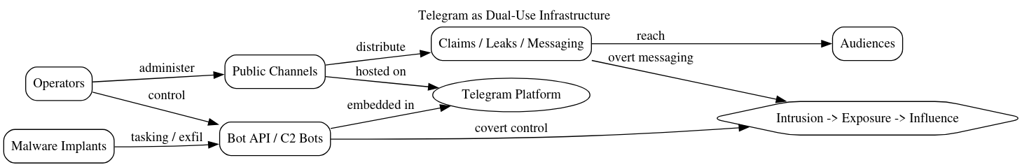 Telegram occupies a central and multifaceted role within this ecosystem, functioning simultaneously as a covert command-and-control (C2) channel and an overt platform for messaging, amplification, and audience engagement. This dual-use design is not incidental; it reflects a deliberate operational choice to consolidate multiple functions, control, communication, and influence within a single, widely trusted platform. By embedding operational activity within a legitimate and globally used service, the actors reduce their reliance on dedicated infrastructure while increasing resilience against disruption. At the same time, the platform’s scale and accessibility allow it to serve as a high-capacity distribution mechanism for narrative content, enabling rapid dissemination of messaging to both targeted and broad audiences.