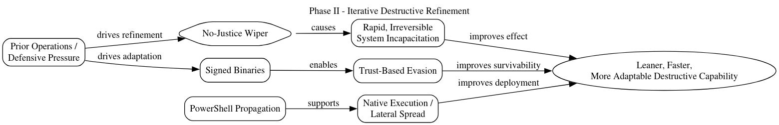 During this period, the introduction of the No-Justice Wiper marked a refinement in destructive tooling. Designed for rapid and irreversible disruption, the malware emphasized system incapacitation, including preventing successful operating system boot. The use of signed binaries suggests an increased emphasis on evasion and trust abuse, while PowerShell-based propagation reflects a growing reliance on native system capabilities to enable flexible and low-friction deployment. Together, these developments indicate an evolution toward more efficient, harder-to-detect operations while preserving the campaign’s core objective of high-impact disruption.