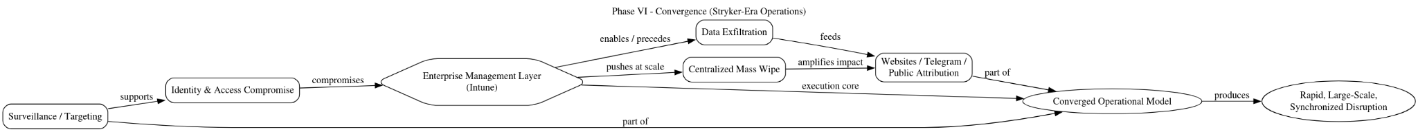 Taken together, the Stryker incident illustrates the campaign’s progression into a fully converged operational framework, where destructive, surveillance, and influence capabilities are no longer sequential phases but simultaneous, interdependent components. The abuse of Intune marks a notable escalation in both technical sophistication and strategic impact, demonstrating that the actors are not only adapting their tooling, but are increasingly targeting the centralized control mechanisms of modern enterprise environments to achieve rapid, large-scale disruption aligned with broader geopolitical objectives.