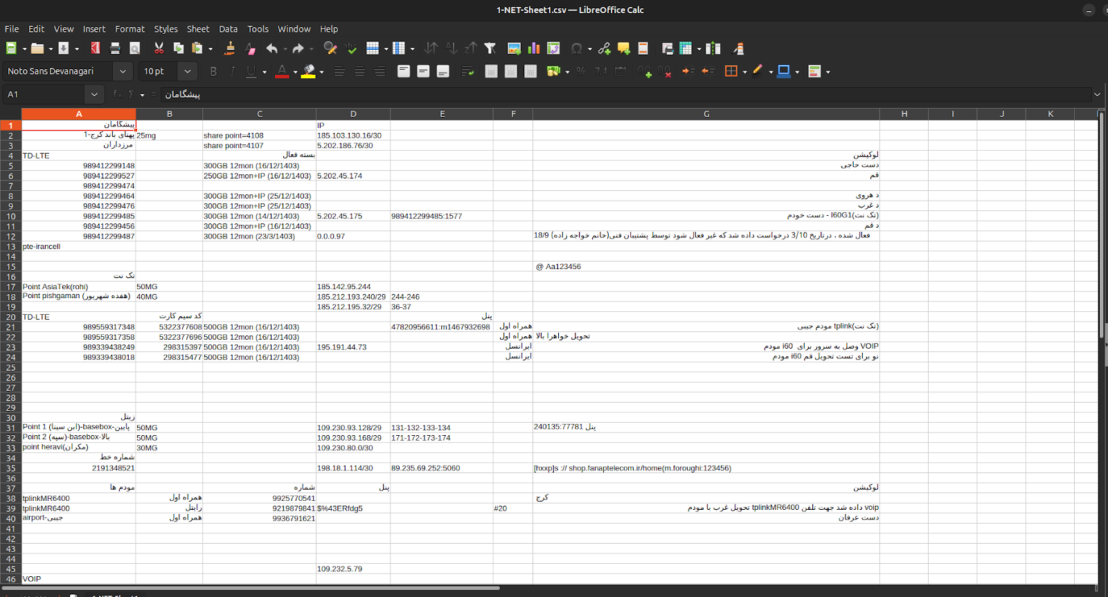 This sheet closes the loop with network addresses: IPs and /29–/30 allocations (e.g., 185.103.130[.]16/30, 185.212.193[.]240/29, 109.230.93[.]128/29, 195.191.44[.]73) with Persian-annotated connectivity and location notes (TD-LTE, service tiers, city markers). These rows correspond to live infrastructure observed in provider dashboards (EDIS, Impreza), matching the same pseudonymous customer identities and service SKUs seen in the invoices. In aggregate, the three files describe an industrial relay: the service sheet assigns and tracks assets, the BTC register funds and reconciles them (with ticket-level joins), and the network sheet manifests them as routable hosts. The tradecraft here isn’t improvisation; it’s administration, an evidentiary chain that converts hierarchy into infrastructure, with the very spreadsheets that ensure renewals also exposing credentials, wallets, and IPs.