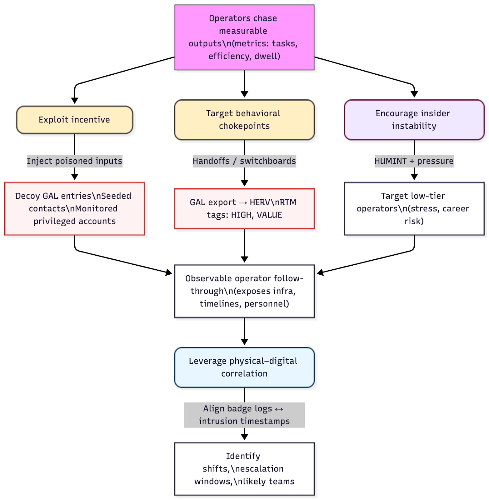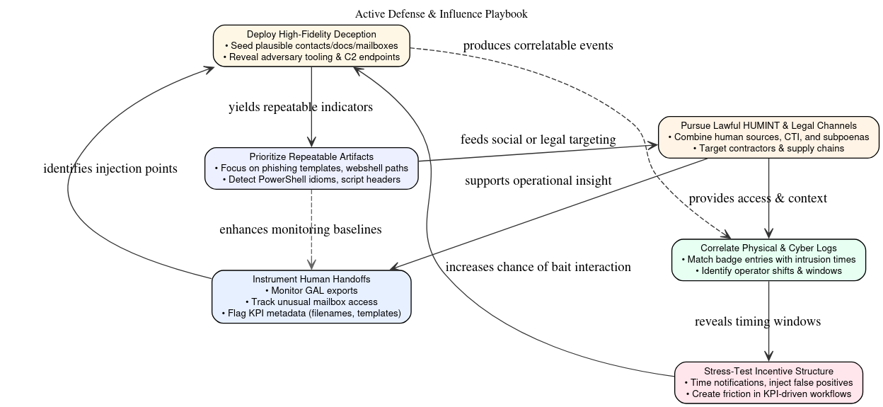 For effective defense, it is crucial to instrument human handoffs and monitor the signals that travel between people and systems: alert on GAL exports, anomalous mailbox access patterns, and KPI workflow metadata (filenames, templates, and report stamps). At the same time, deploy high-fidelity deception, seed plausible contacts, documents, and mailbox content designed to make adversaries reveal tooling, extraction paths, or C2 when they act on the bait. Where lawful HUMINT or partner cooperation is available, correlate badge entry/exit logs with intrusion timestamps to map shifts and likely operator windows, and use carefully timed notifications, managed false positives, and controlled exposure to introduce measurable friction into their metric-driven processes to slow their cadence without risking sensitive data. Rather than only chasing novel malware,defenders should prioritize detection engineering for repeatable artifacts, template-based phishing HTML, reused webshell paths, script headers, and standardized PowerShell idioms, and combine these technical measures with lawful HUMINT and legal process to target the social and supply-chain nodes that sustain centralized operations.