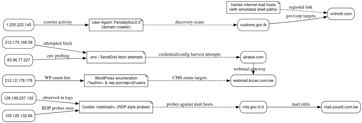 HTTP logs show a mix of automated reconnaissance and opportunistic credential harvesting that includes Cookie: mstshash= payloads indicative of RDP-style probes, attempts to fetch .env and SendGrid configuration files, and WordPress enumeration hits such as /?author= and /wp, json/wp/v2/users. Crawling activity is sometimes identifiable by user agent strings like Pandalytics/2.0, which the operators used for domain discovery and prioritization. Together, these domain, host, and HTTP indicators map a coherent reconnaissance to exploitation pipeline focused on mail infrastructure, credential harvesting, and rapid post-compromise expansion.