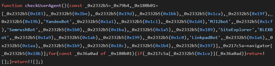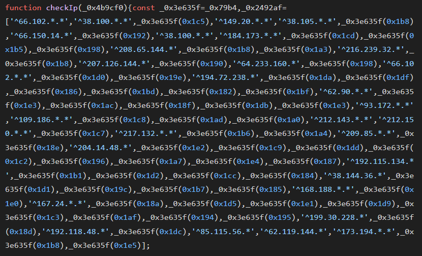 Aggressive IP and User-Agent Filtering: The site code fetches details about the visitor's IP using https[:]//api.ipify[.]org/?format=json and checks it against a hardcoded blocklist. This list includes ranges belonging to major security companies (Palo Alto, FireEye) and cloud providers (AWS, Google), as well as search engine crawlers.