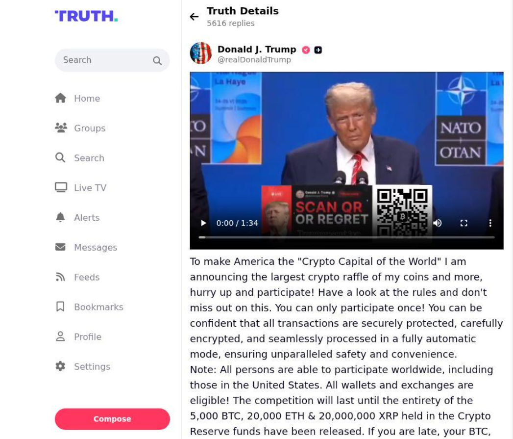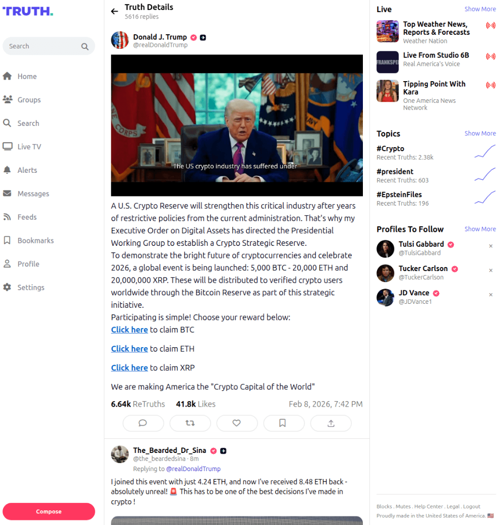 Replicate the Truth Social interface with fake posts attributed to Trump about crypto policy or giveaways.