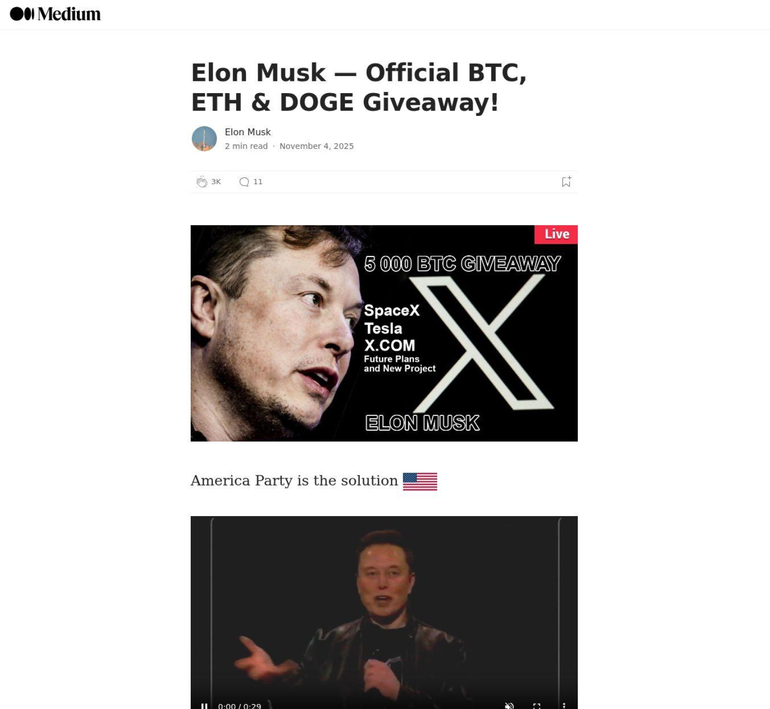 Similar scam sites spoofs as a Medium platform page and masquerade as a user named “Elon Musk” such as the following screenshot of “usaevent[.]live”.