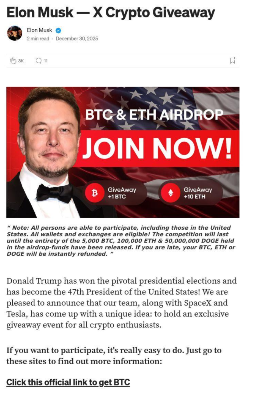 In the past few years, some public figures including President Donald Trump and Elon Musk began promoting investments in various crypto currencies named in their likeness or that they were prominent holders of on their social media platforms they own, Truth Social and X (formerly Twitter) respectively. $TRUMP coin for example was created on January 17, 2025 and endorsed by the official Trump Truth Social account. Likewise the $WLFI coin, in which Trump and his children are listed as co-founders and executives. $MELANIA similarly was endorsed by official Melania Trump posts on X platform. The list goes on, earning Trump the title of “Crypto President”. Elon Musk has had a longer history of high profile endorsements of crypto currency. In fact, repeated posts about pushing his viewers on X to invest in Dogecoin for example led to him calling himself the “Dogefather” on Saturday Night Live. As these figures have made posts promoting or endorsing these currencies, threat actors have begun spoofing these endorsements and promotions to trick users into crypto scams. They spoof the real social media pages and posts and promote crypto currency much like the real personas do but for their own gain.