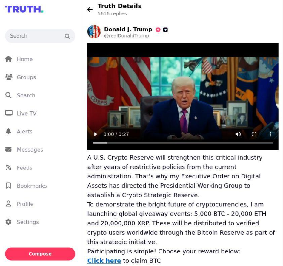 Example scam sites “trump4u[.]org” and “trumppresent[.]top” masquerade as Truth Social posts by President Trump that purports to have signed an executive order to hand out cryptocurrency rewards to those that click the links. While it is true that President Trump has officially established a Strategic Bitcoin Reserve and a U.S. Digital Asset Stockpile, the specific posts are designed to look like related Truth Social posts to trick users into participating in a fraudulent giveaway.