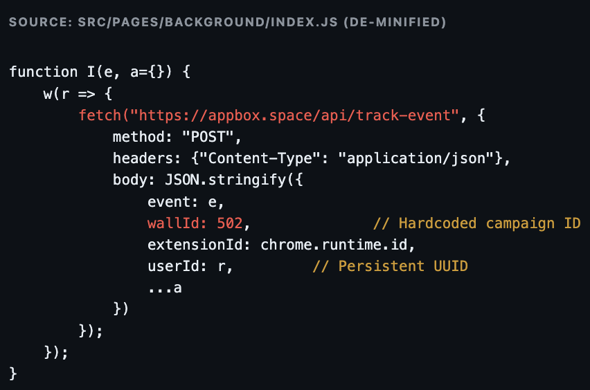 Within the code for the downloaded extension there is a file “background/service-worker.js”, that handles the installation and uninstallation. Its code is minified, the following is a de-minified showing of its contents.